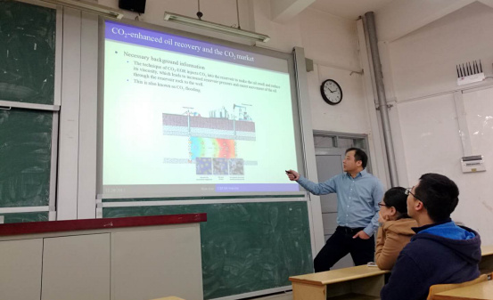 会上高老师先讲述其研究动力和研究背景,表明采用二氧化碳强化采油技术的石油公司将二氧化碳作为增加石油产量的投入,这与其他行业的长期合约中的典型价格调整条款大不相同。然后其设定一些假设,建立单合同模型和双合同模型来计算比较水驱动模式石油年产量和二氧化碳驱动模式石油年产量两种情况下的二氧化碳销售合同价格。通过程式化的模型表明,二氧化碳市场自身的特点使得二氧化碳卖方总是设定限定价格而不是固定价格。然而,基于活性二氧化碳强化采油项目的数值模拟表明,实际二氧化碳合同中观察到的固定系数明显低于我们的理论。模拟还表明,最优的钉住系数对中值石油价格和二氧化碳的利用效率很敏感,但对石油价格分布的波动性不敏感。低收缩的二氧化碳价格可能反映了其利用效率的事前不确定性。高老师有条不紊的讲解其研究内容,耐心详细地解答老师和同学们提出的疑惑,在座的同学们一边认真听着讲解一边做笔记,气氛颇为活跃。