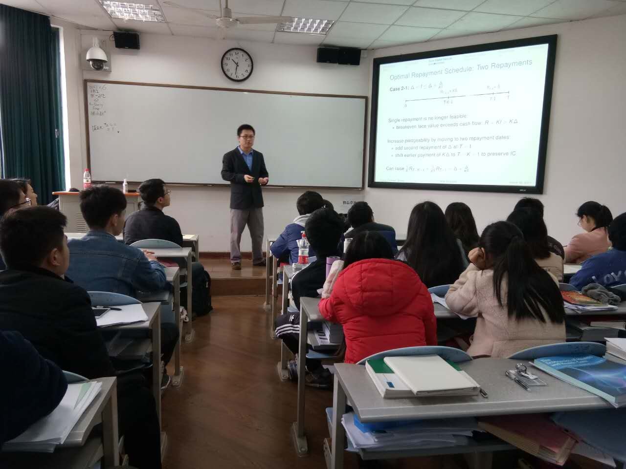 钟老师主要介绍了一个公司债务期限结构模型。其得到的最优债务合同可以使得,通过提供足够的终止威胁带来的债务偿还激励相容(支持早期还款)与人们想要避免代价高昂的早期清算的期望(倾向于后期偿还)得到平衡。这个简单的权衡,内生地决定了(1)还款的次数,(2)还款的时间,(3)承诺还款金额数目。研究得出,现金流风险稳定并且需要大量外部融资的公司,会更早的,更频繁的偿还债务,实际上也就是一系列的短期债务合同。现金流增长或存在大量无风险的现金流的公司,风险的还款日数的增加会降低保证收益。而且在某些情况下,投资者的保证收益能够最大化,例如一个高风险的期末一次性偿还合同。这实际上也就是一个长期债务合同。钟老师所阐述的内容井井有条,深入浅出,老师与同学们也对该问题进行了积极地探讨。